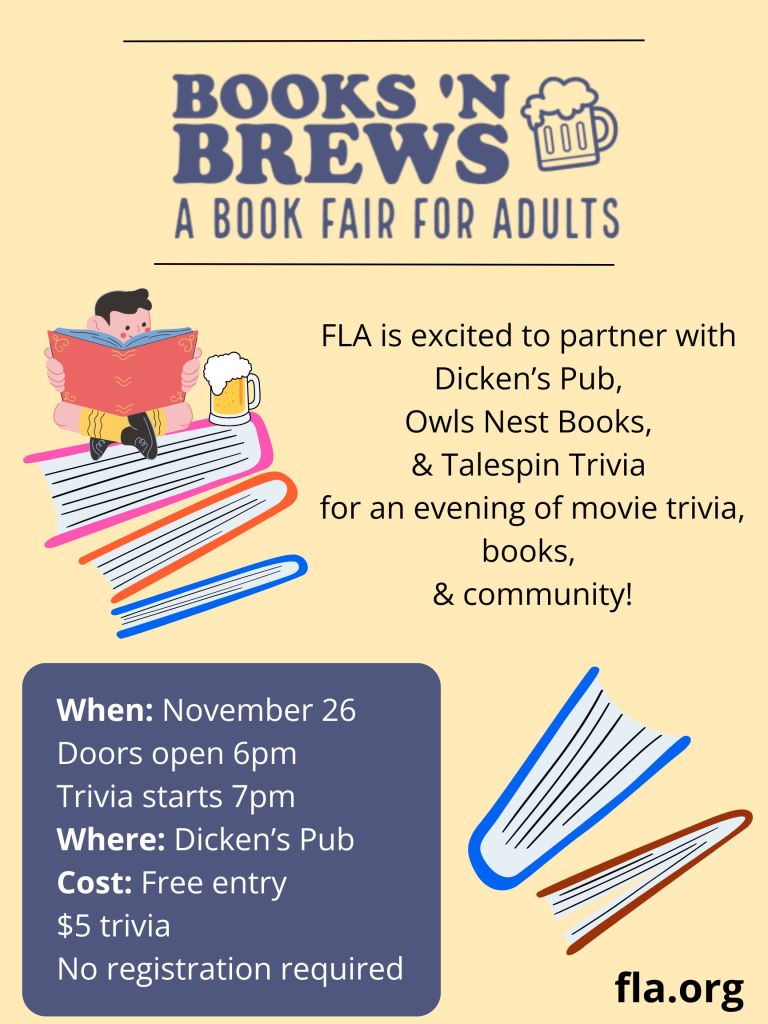 Books N Brews will be taking place on November 26th at Dicken’s. Doors open at 6, and trivia starts at 7pm. We look forward to seeing you there!